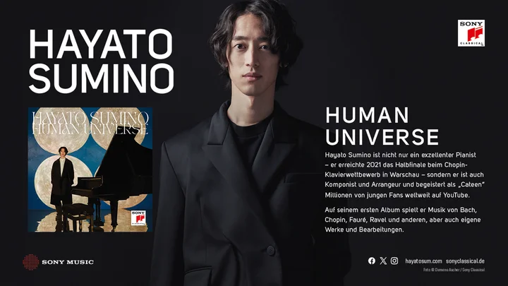 Das ist auch das Motto seines Heinersdorff-Programms mit dem sprechenden Titel Human Universe. Hier begegnen Bach und Chopin Eigenkompositionen von Hayato Sumino – ja, komponieren kann er auch! – sowie hierzulande unbekannten Komponisten wie Nikolaj Kapustin und ausgefallenen Arrangements bekannter Werke. Ein besonderes Highlight: Hayato Suminos Bearbeitung von Maurice Ravels Boléro für Klavier. Viel Spaß!